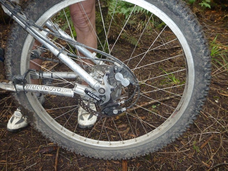 We were down "Old Chevy", a track near the bottom of the forest when climbing a steep hill the back wheel jambed. It was only about 3 or 4 km walk to Planet Bikes where we spoke to Lorelle who suggested Dave Fisher. Amazingly he lived at the end of the street where we were staying in Lynmore. Dave had his son Craig pick us up and felt he could fix our bike.