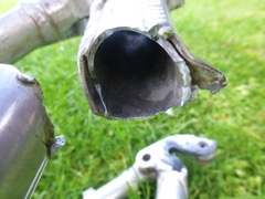 The next mooring I returned and Dave had inserted perfectly fitted sleeve into the chain stay. We checked the wheel alignment and unfortunately the stay was too long. After a considerable amount of work we removed the rear part and filed down the break. It took a few goes but eventually we got it perfectly aligned and Dave glued it pack together.