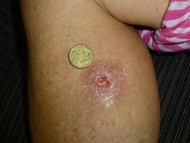 15 days after belly graze: Monday 23rd at doctors. Boil on Annette's Calf after local anaesthetic. Note the white ring colouring above the welt showing anaesthetic taking effect.